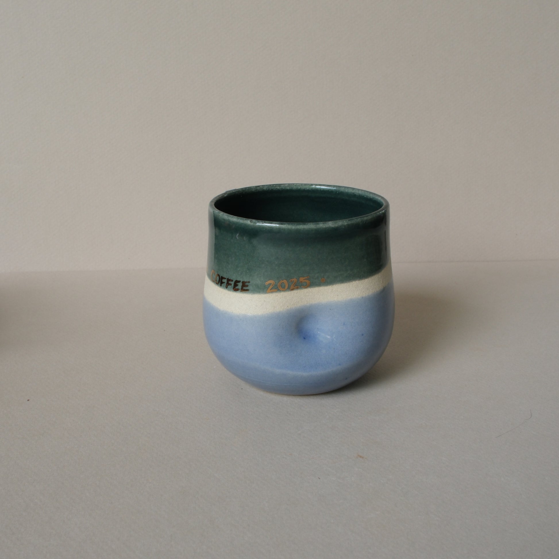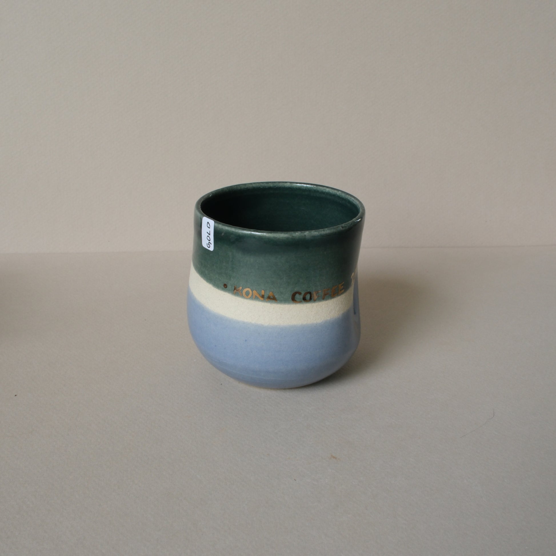 This cup is part of the 100% Kona Coffee Collection featuring handmade pieces. Text in Gold luster "Kona Coffee 2025"