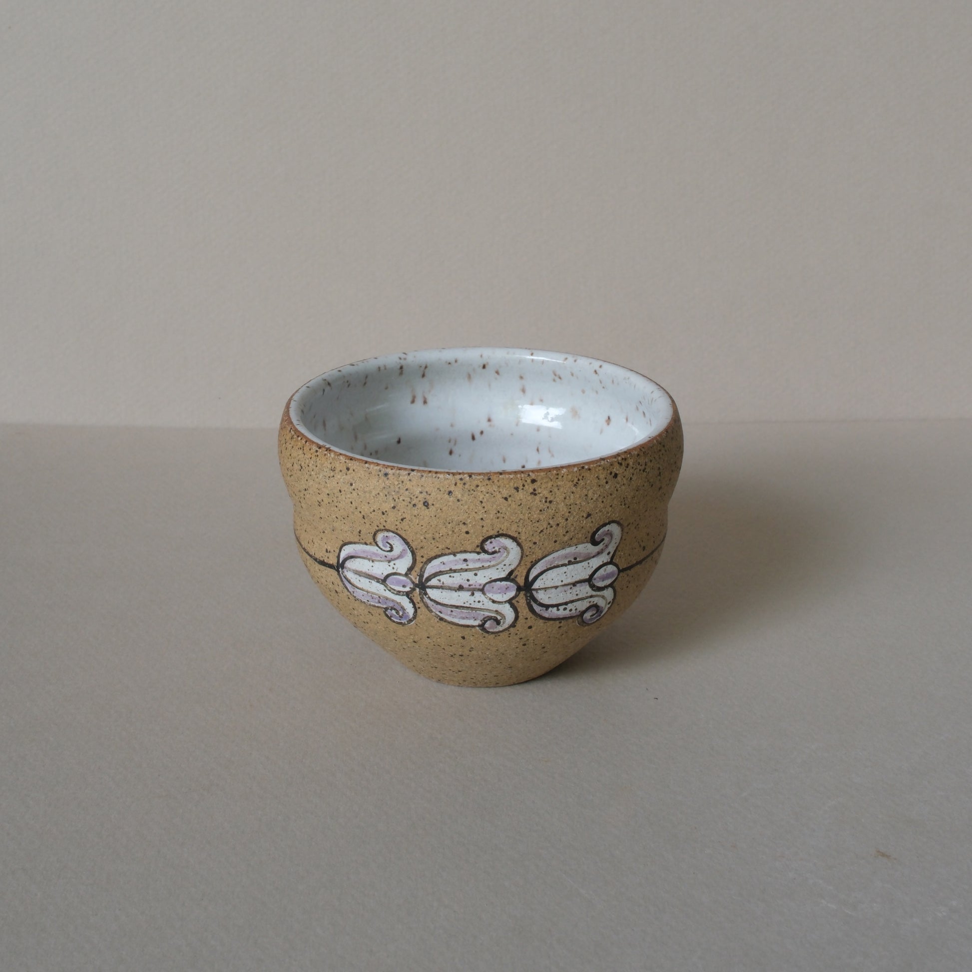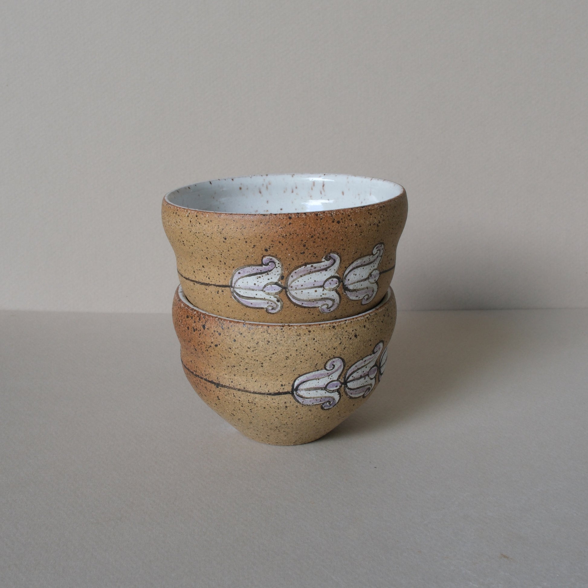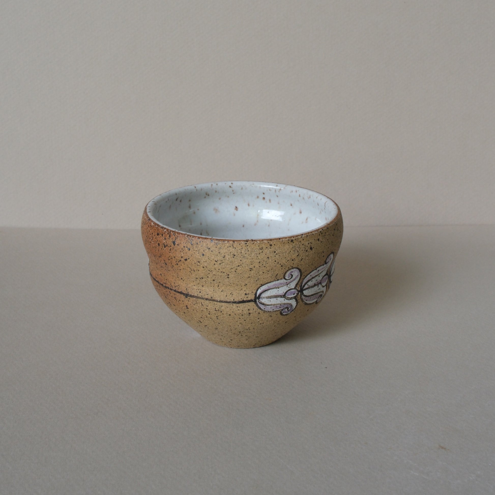 Crown Flower hand painted on cup with White speckled glaze on speckle stoneware.