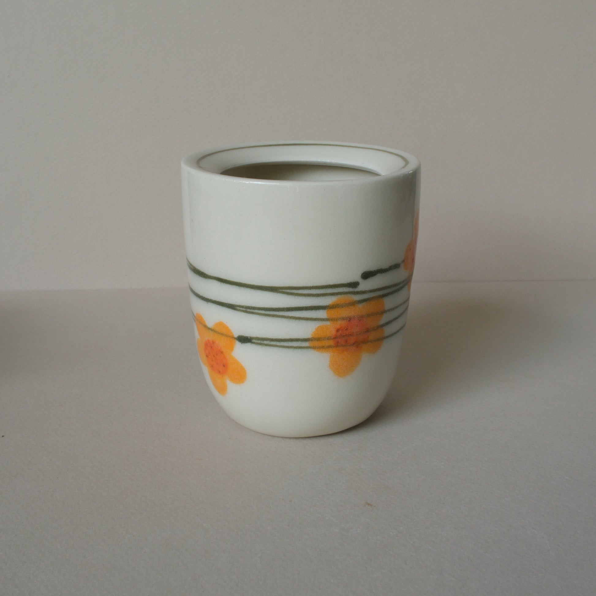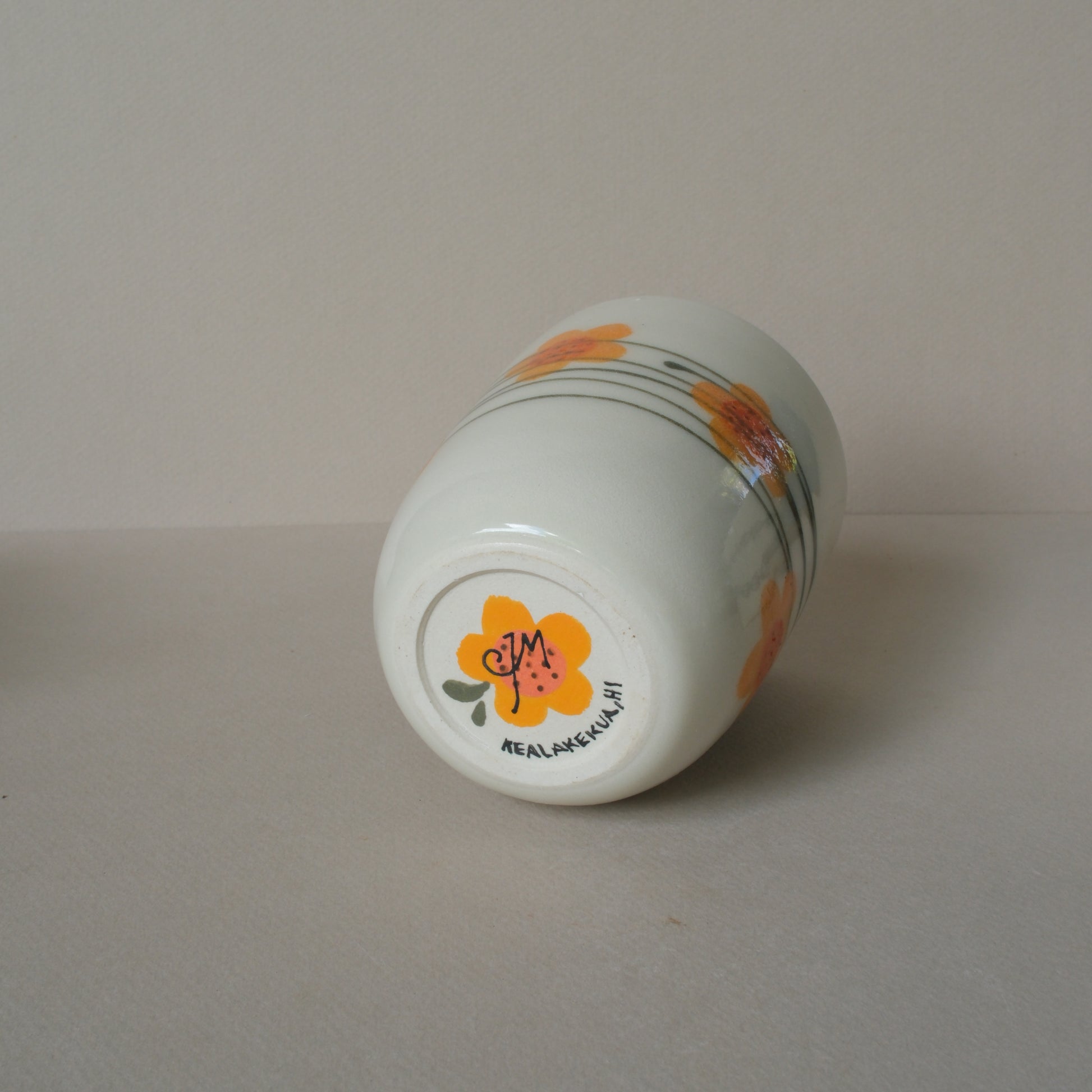 Floral Bloom pattern on white stoneware. This lipped travel mug is for easy to go use and comfortable sipping.