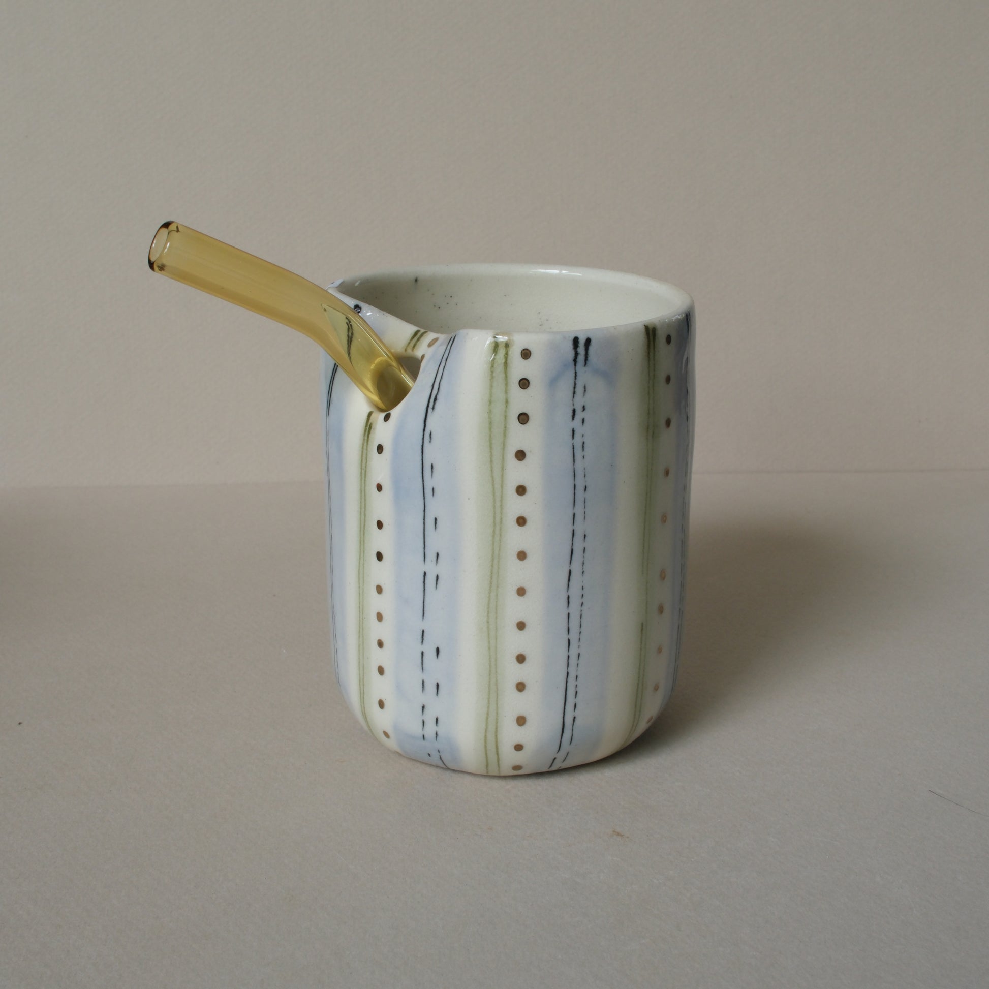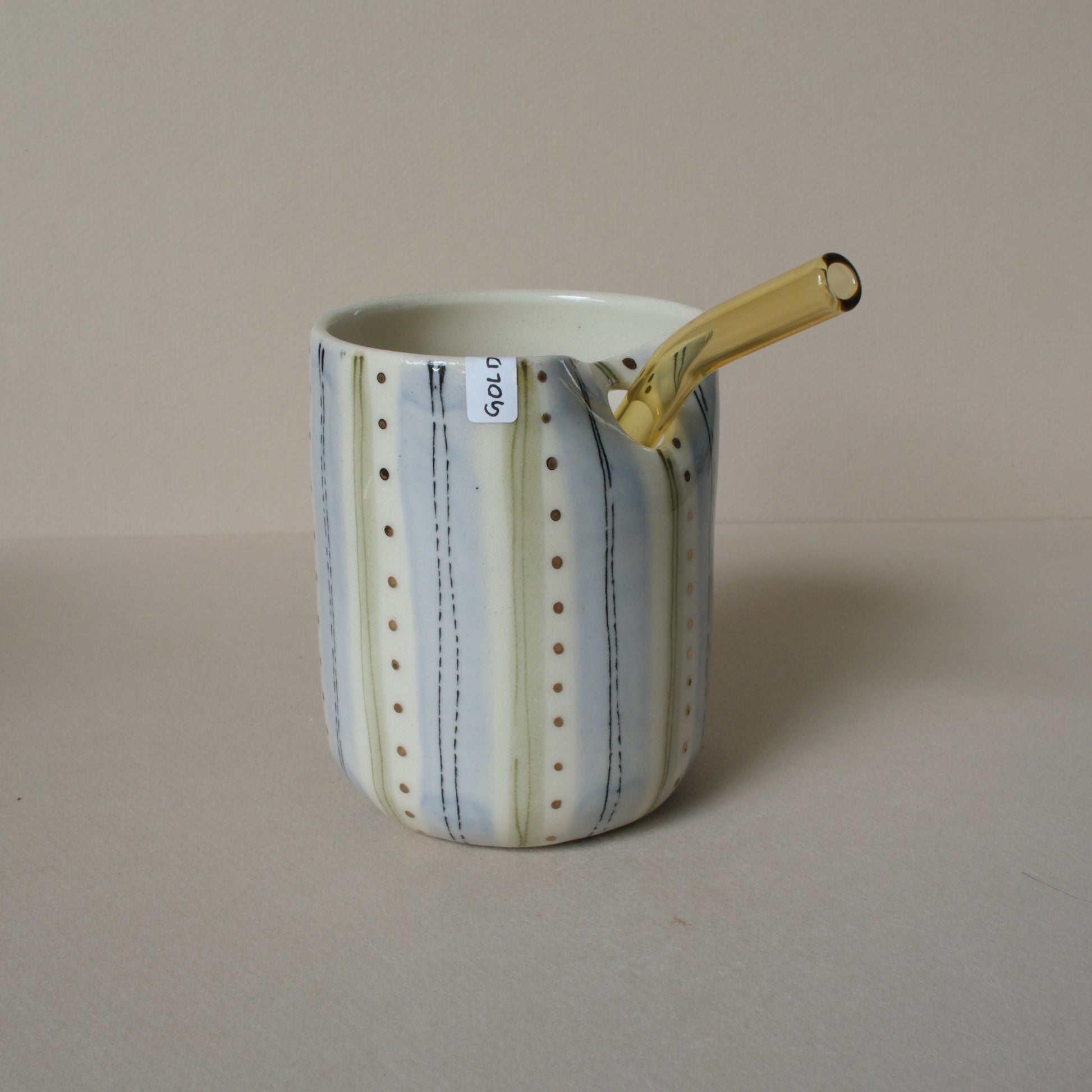 Straw cup with colorful stripes, gold lustre accents on White stoneware. Comes with 6" Yellow glass straw.