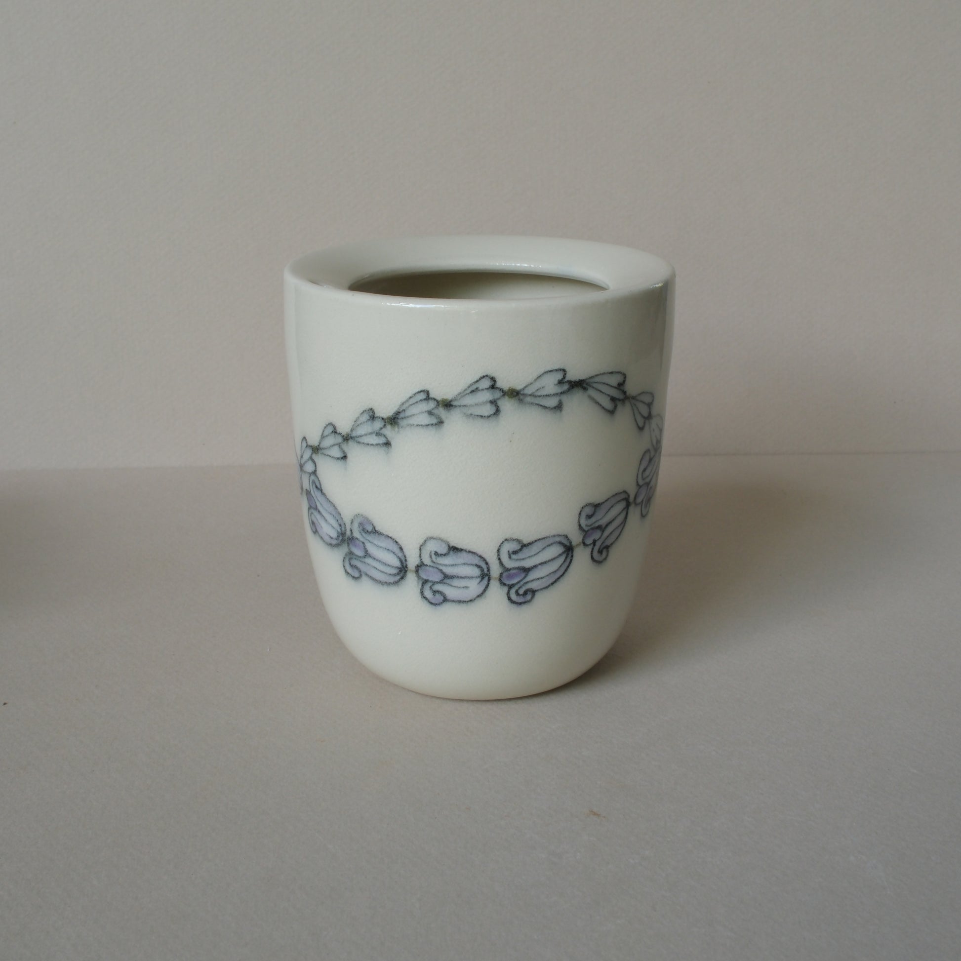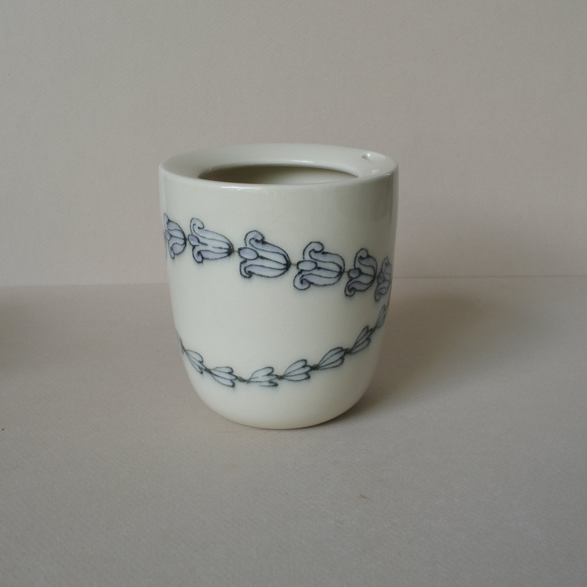 Pikake and Crown Flower pattern on white stoneware. This lipped travel mug is for easy to go use and comfortable sipping.