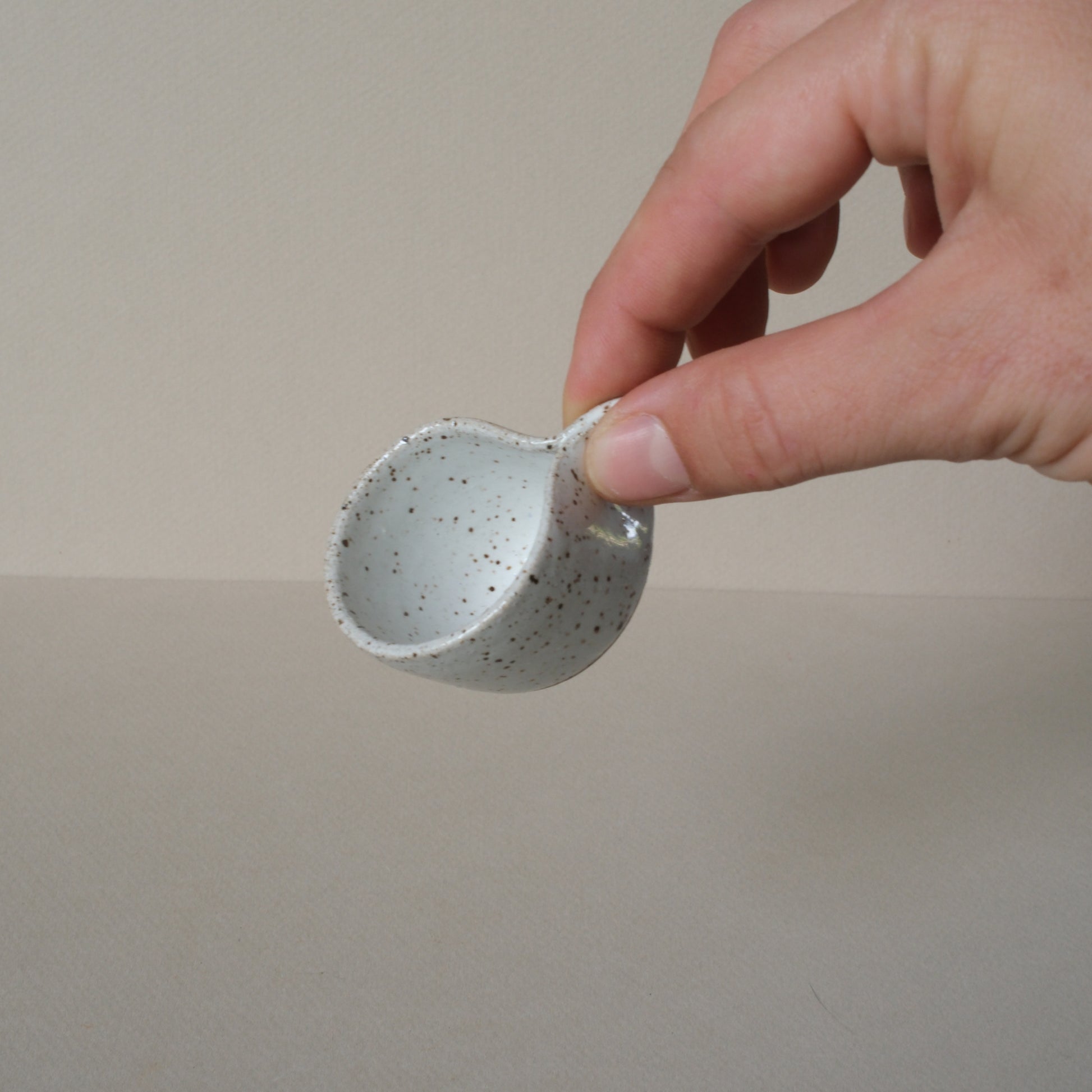 Sampler Pinch cup with White Gloss Glaze on raw Speckled Stoneware.