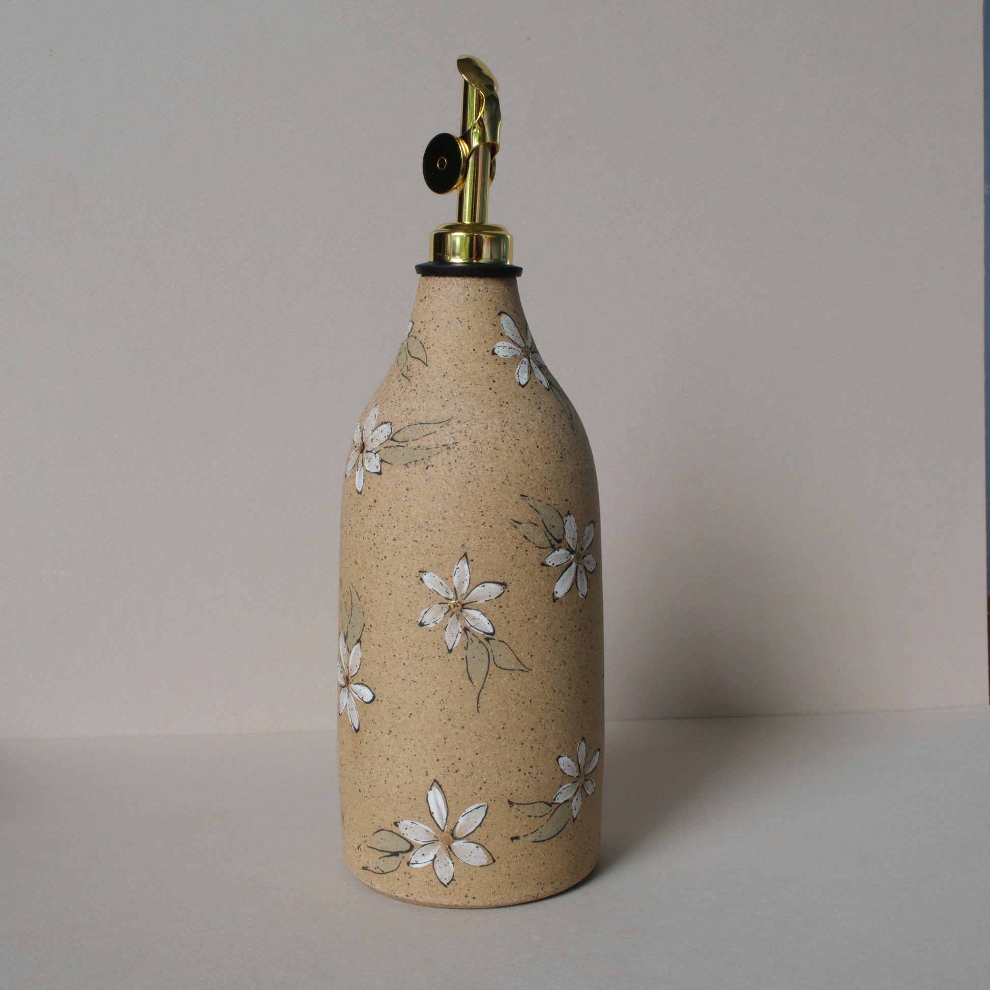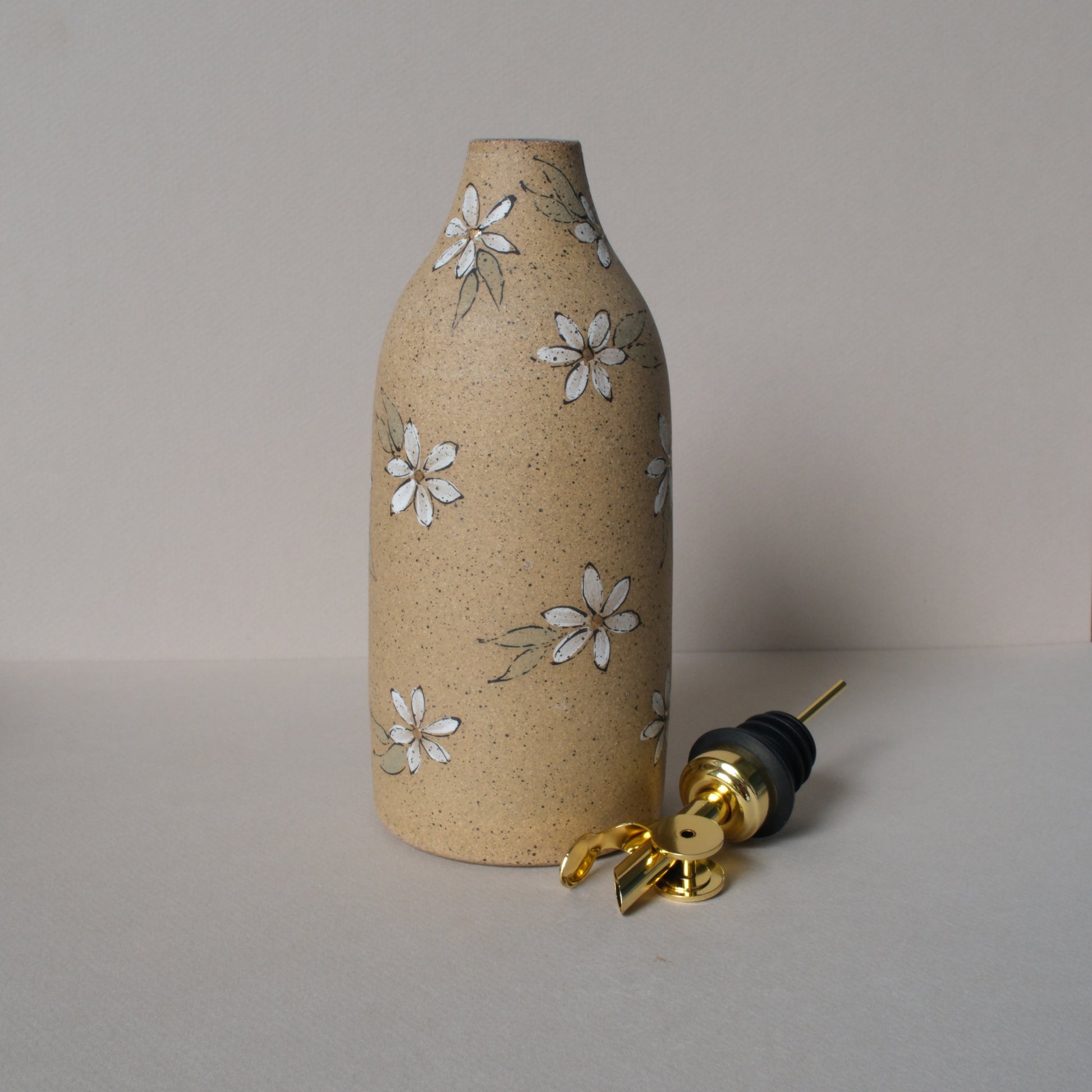 The exterior features a star flower design on a raw clay finish with small bright gold luster accents. Interior is food safe featuring a transparent blue glaze. This cruet is the perfect oil dispenser and comes with a spout for pouring easily.